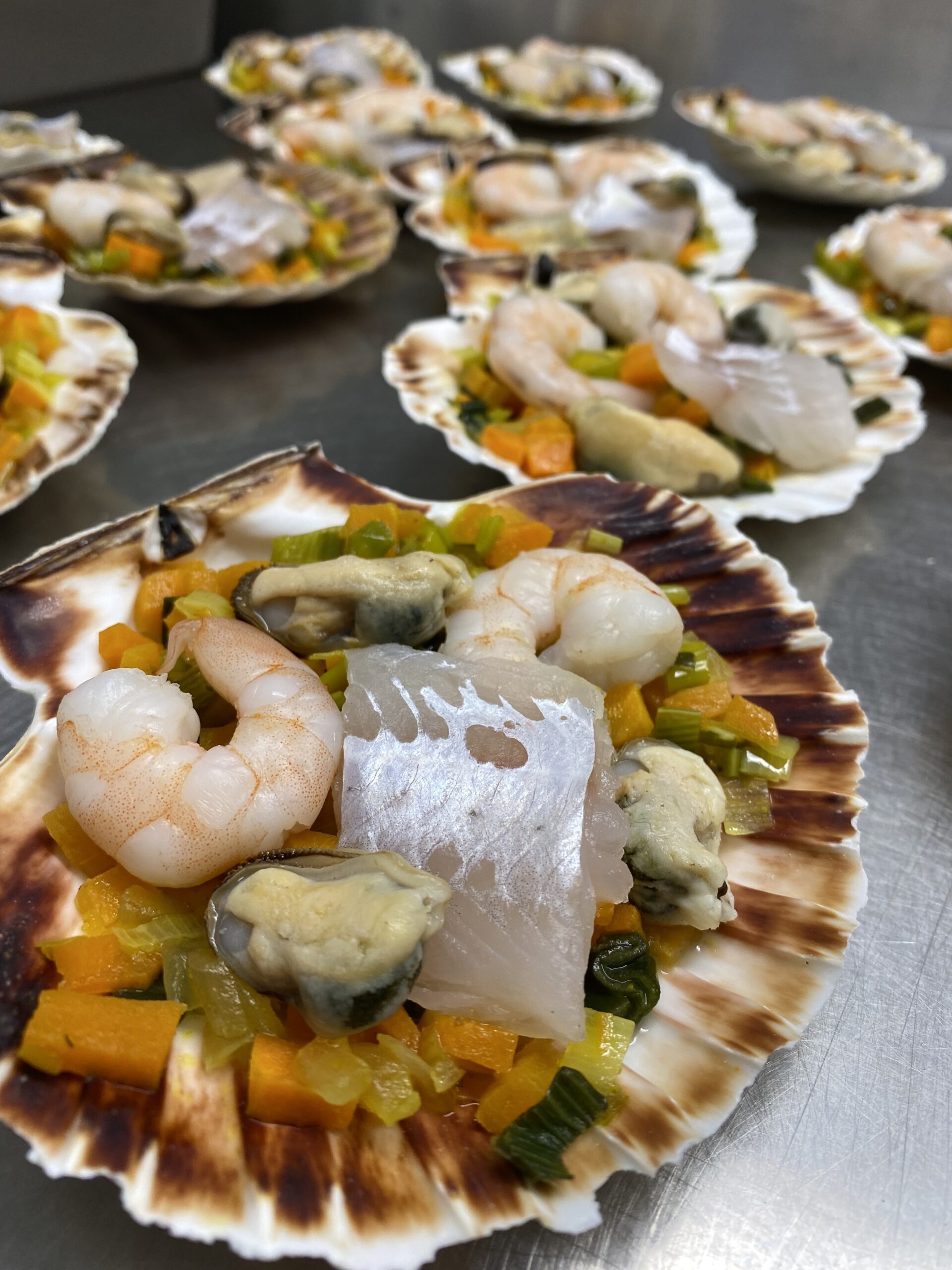 Coquille garnie d’une poêlée de petits légumes (oignons, carottes, poireaux) et d’un mélange de la mer avec crevettes, moules et poisson blanc, le tout nappé d’une béchamel maison aux épices colombo.